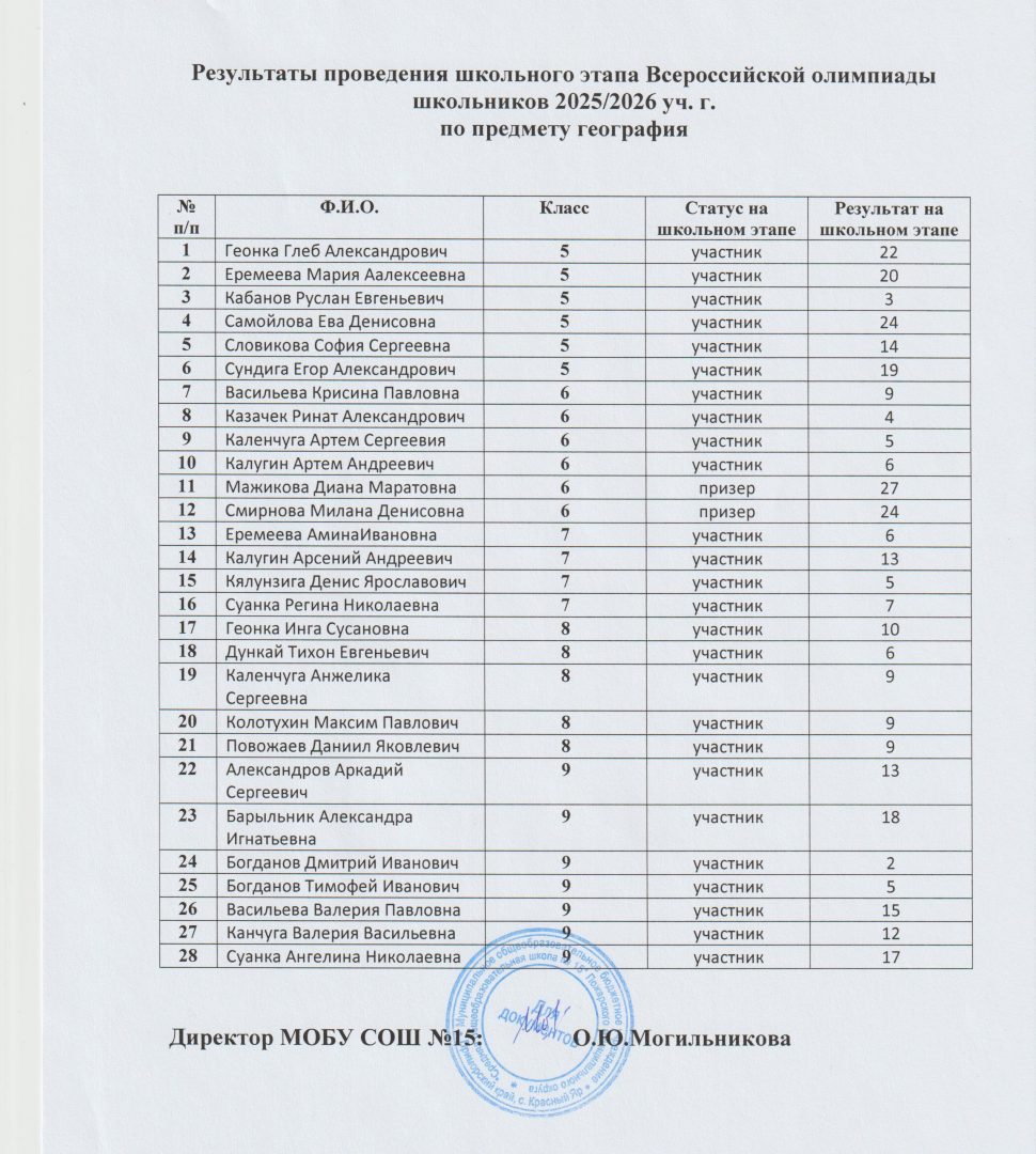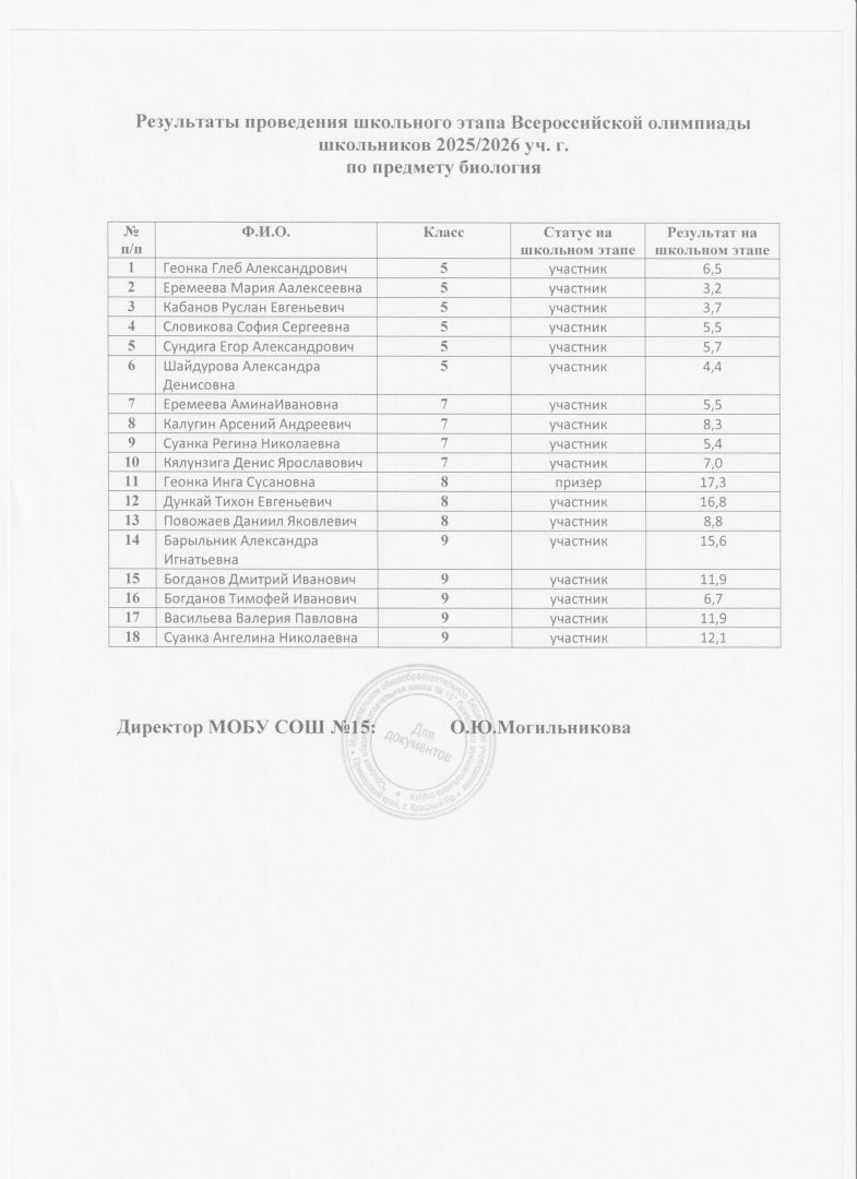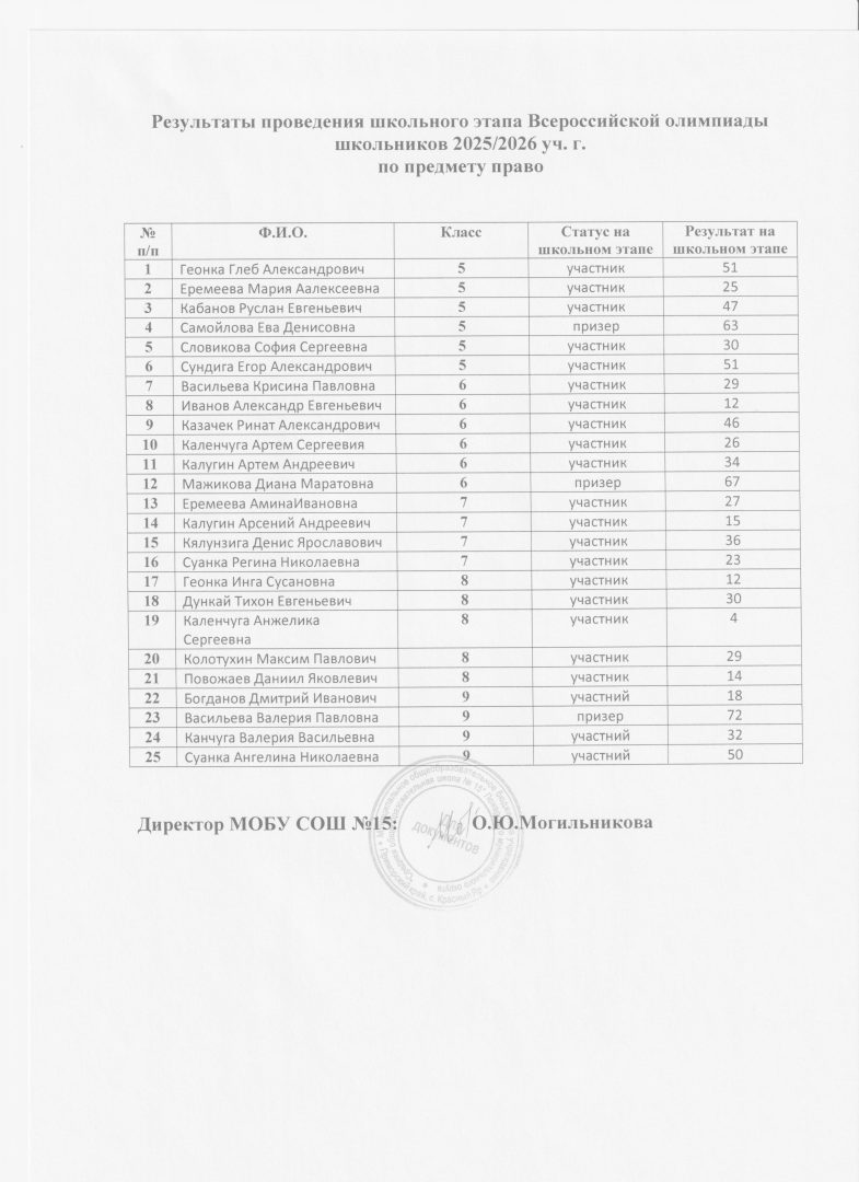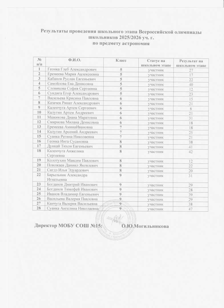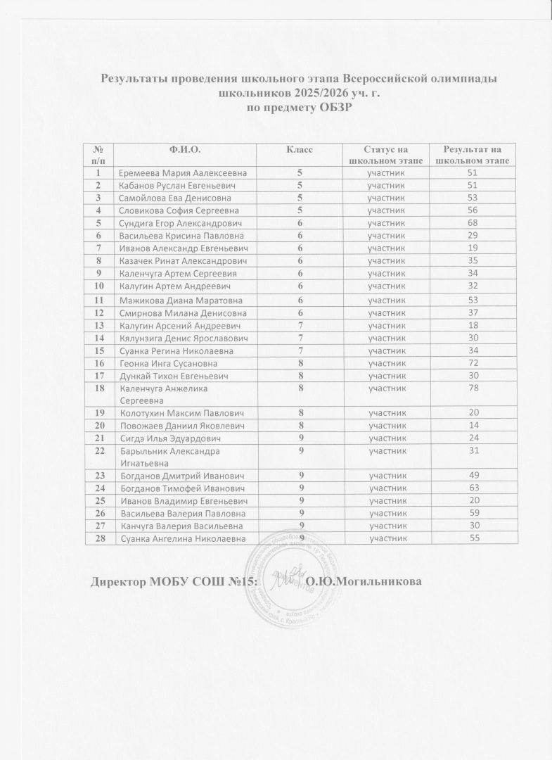 РЕЗУЛЬТАТЫ ВСЕРОССИЙСКОЙ ОЛИМПИАДЫ ШКОЛЬНИКОВ (школьный тур) 2025-2026 учебный год