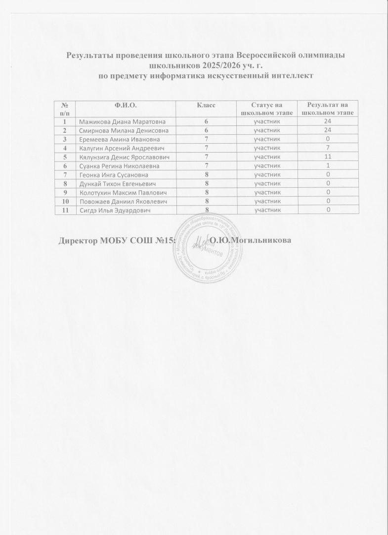 РЕЗУЛЬТАТЫ ВСЕРОССИЙСКОЙ ОЛИМПИАДЫ ШКОЛЬНИКОВ (школьный тур) 2024-2025 учебный год